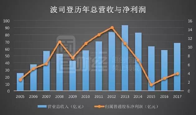 波司登日前发布的业绩报告显示,2017财年(截至2017年3月底)总营收为68.25亿元,同比增长17.6%,净利润3.92亿,同比大涨39.48%。这扭转了此前雪崩式的下滑,从2013年到2016年,波司登的营收从93.38亿降低到58.08亿,跌幅达37.81%;净利润更是暴跌了73%。下图为面包财经根据财报绘制的波司登历年总营收与净利润: