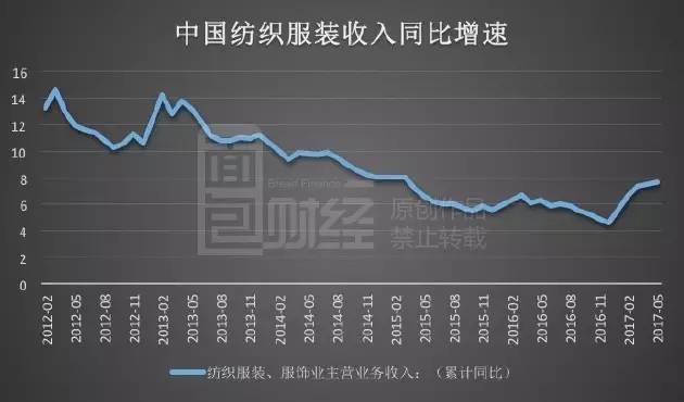 事实上,中国整个纺织服装行业整体出现了复苏。据国家统计局数据,截至今年5月底,中国纺织服装、服饰业主营业务收入为9225亿,同比增长7.7%;利润总额522.3亿,同比增长9.4%;营收与利润增速大幅高于去年同期。下图为面包财经根据国家统计局数据绘制的中国纺织服装收入同比增速: